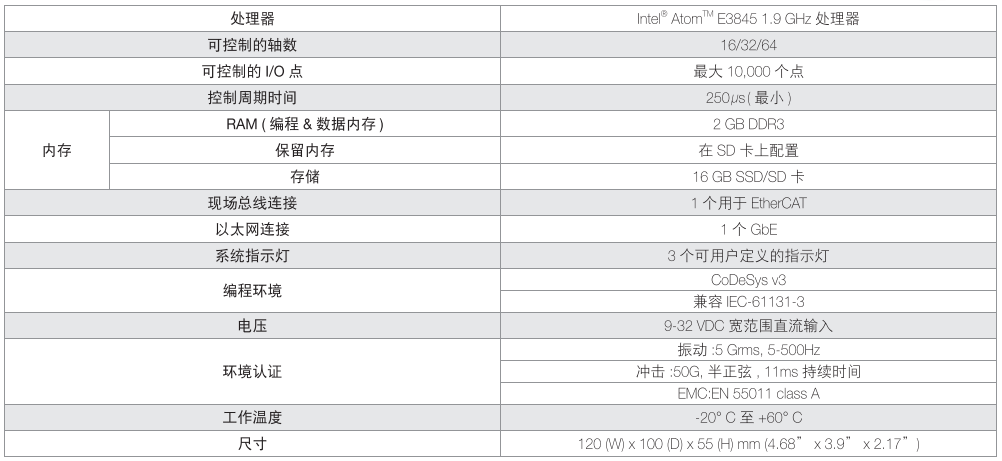 Talos-3012 基于Intel® Atom™ E3845 1.9 GHz处理器的EtherCAT主控 制器,支持IEC 61131-3 |