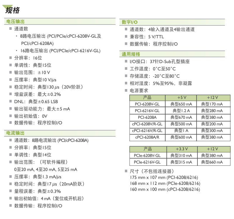 PCI-6208V-GL 8通道16位分辨率电压输出卡 PCI-6216V-GL 16通道16位分辨率电压输出卡 PCI-6208A 8通道16位分辨率电压和电流输出卡 |